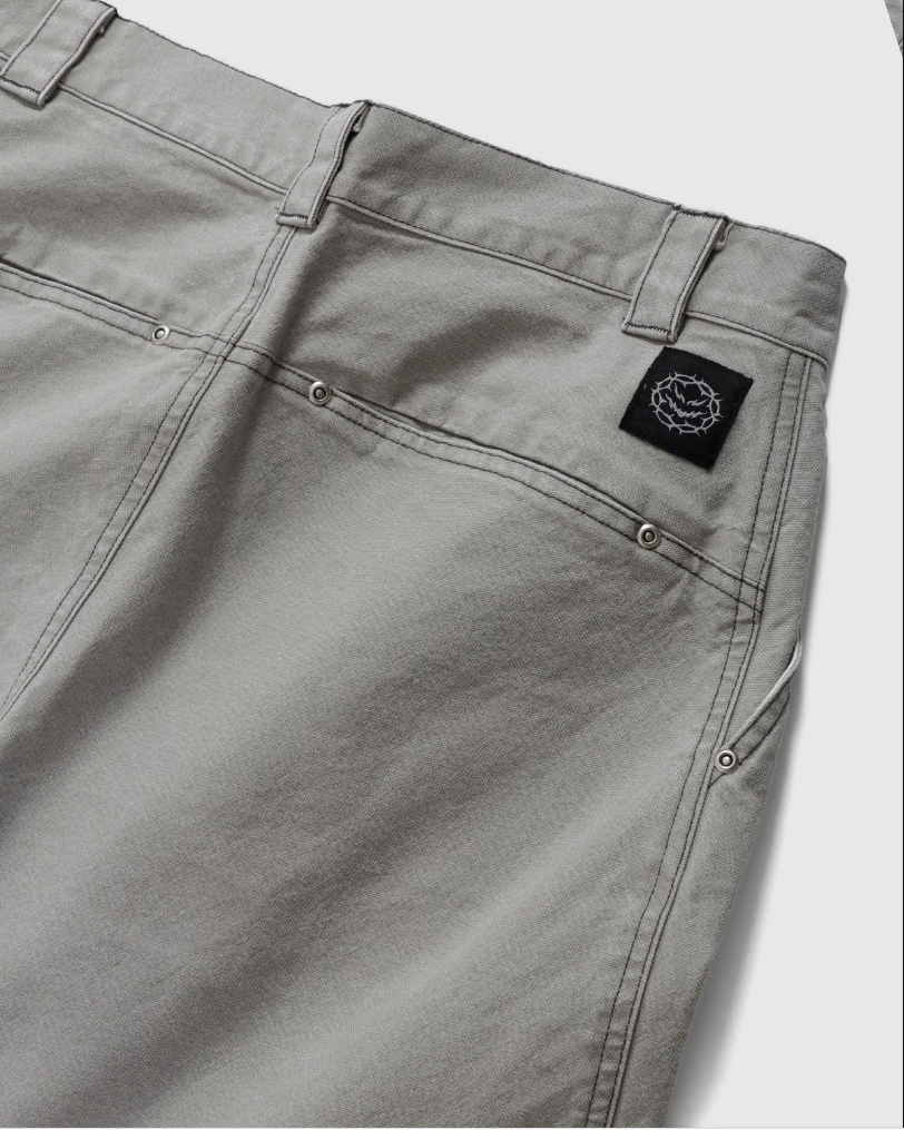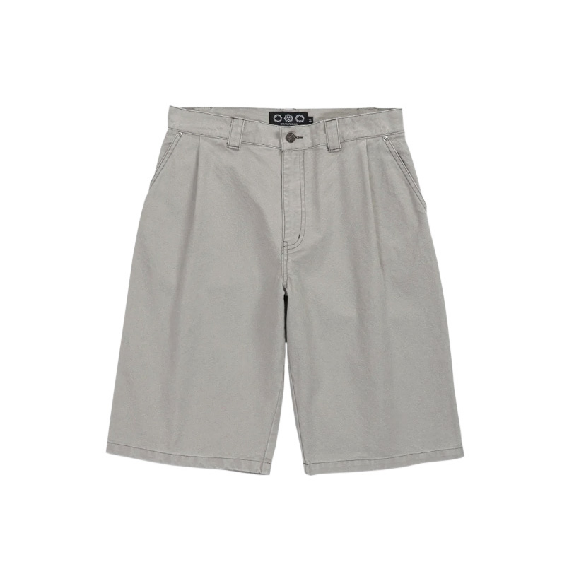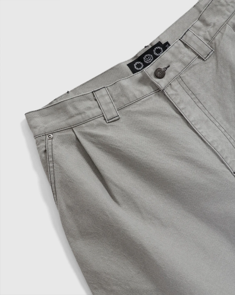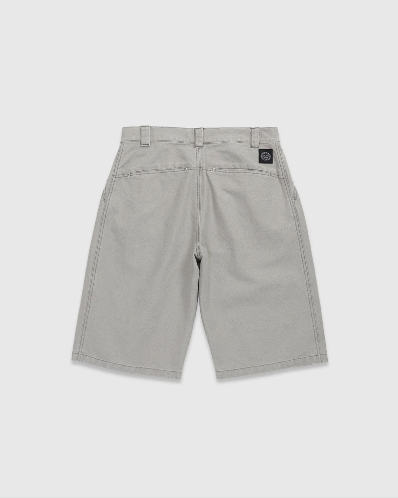 Curb Crawlers ‘Rivet’ Canvas Work Short – Ivory. Designed in Melbourne. Loose Fit. Single Front Pleat. Concealed Rear Pocketing. Charcoal Stitching. Rivet Pocket Detailing. YKK Fly Zipper. ‘Gunmetal’ Logo Shank Button Closure. Herringbone Internal Pocket. Woven Patch Branding.